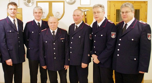 (von rechts) Bendfeld Wehrführer Georg Federn, der selbst zum Oberfeuerwehrmann befördert wurde, konnte Carsten Glücsing, Jochen Stoltenberg, Gerhard Sass, Jan Puck und Mayk Ziegler befördern oder für langjährige Mitgliedschaften ehren.