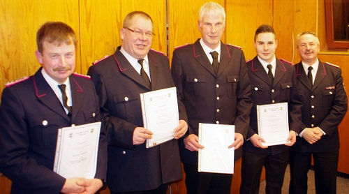 (von rechts) Wehrführer Dieter Hassler beförderte Eike Haasler und Heino Treede. Michael Kalbhenn und Kai Finck-Stoltenberg wurden für jangjährige Feuerwehrmitgliedschaft ausgezeichnet.