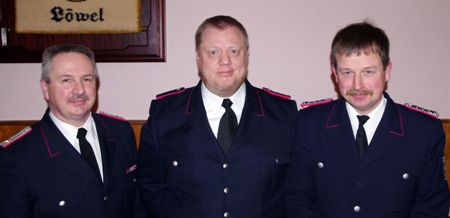 Wehrführer Dieter Haasler (links) freute sich Tua Löschmann (Mitte) als neues Mitglied der Wehr zu begrüßen. „Mit diesem Namen musst Du ja auch Feuerwehrmann werden“, so Haasler. Kai Finck-Stoltenberg (rechts) wurde zum Löschmeister befördert.