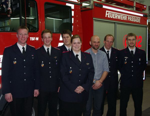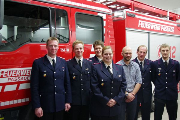 Passades Wehrführer Hauke Klindt (links) versammelte die beförderten und geehrten Mitglieder vor dem neuen Löschfahrzeug. (ab 2 von links Jan Thore Pieper, Hannah Steinhard, Till Steinhard, Julius Schettel, Thomas Pieper und Finn Ole Greve.