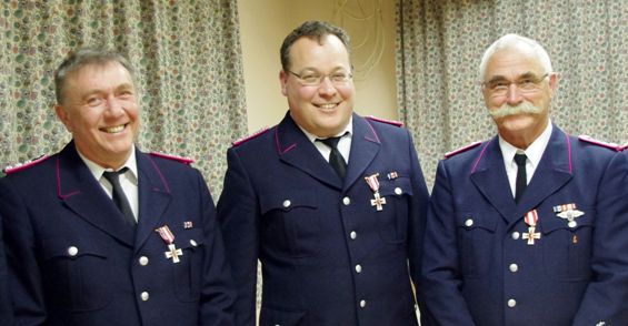 Bürgermeister Karl-Otto Knust, selbst Träger des blauen Rocks, ehrte Manfred Stuhr für 40-jährige Mitgliedschaft in der Wehr und verlieh ihm das Brandschutzehrenabzeichen in Gold. Mit dem silbernen Abzeichen für 25-jährige Mitgliedschaft wurden anschließend Lutz Schlünsen und Heinz-Otto Schoel geehrt.